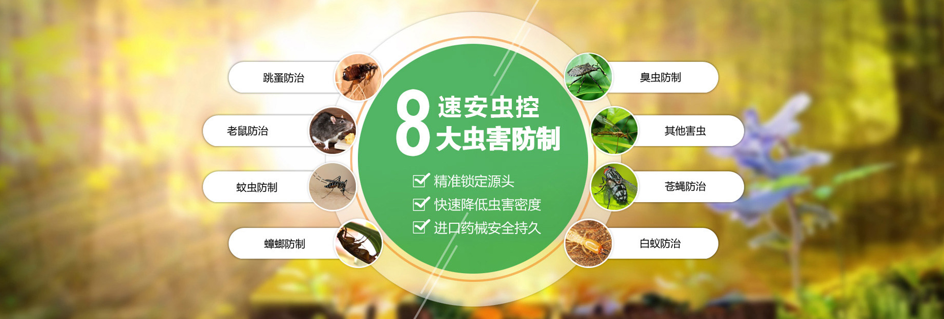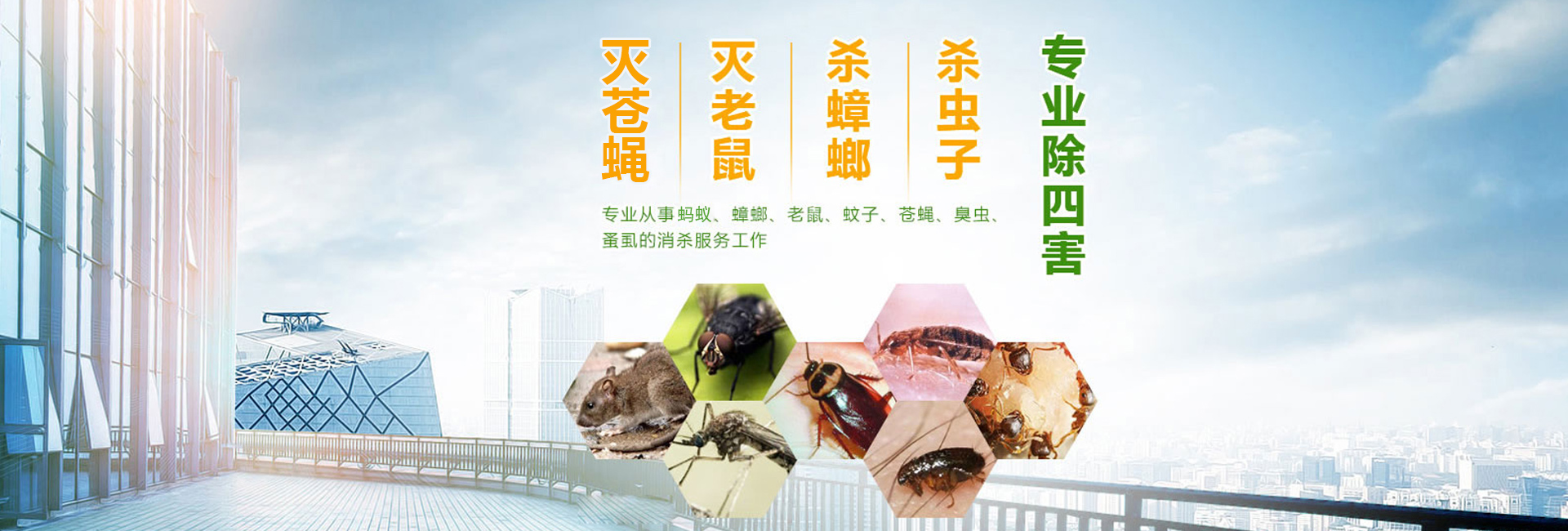 服務于為賓館飯店、餐飲業(yè)、食品加工業(yè)、建筑業(yè)、商場、超市、學校、工廠、醫(yī)院等單位和家庭提供鼠蟲害等有害生物防治。